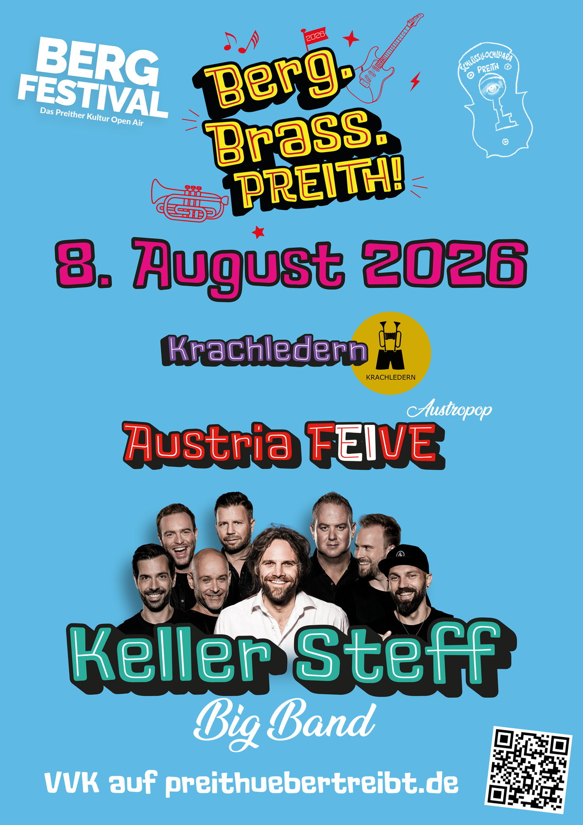 Der Bandabend des Preither Bergfestivals wird am Samstag, 08.08.2026, so richtig Spaß machen. Mit der Keller Steff Big Band konnte eine in Bayern und Österreich äußerst bekannte Band engagiert werden, die regelmäßig auch als Headliner beim Brassfestival oder beim Woodstock der Blasmusik auftritt.